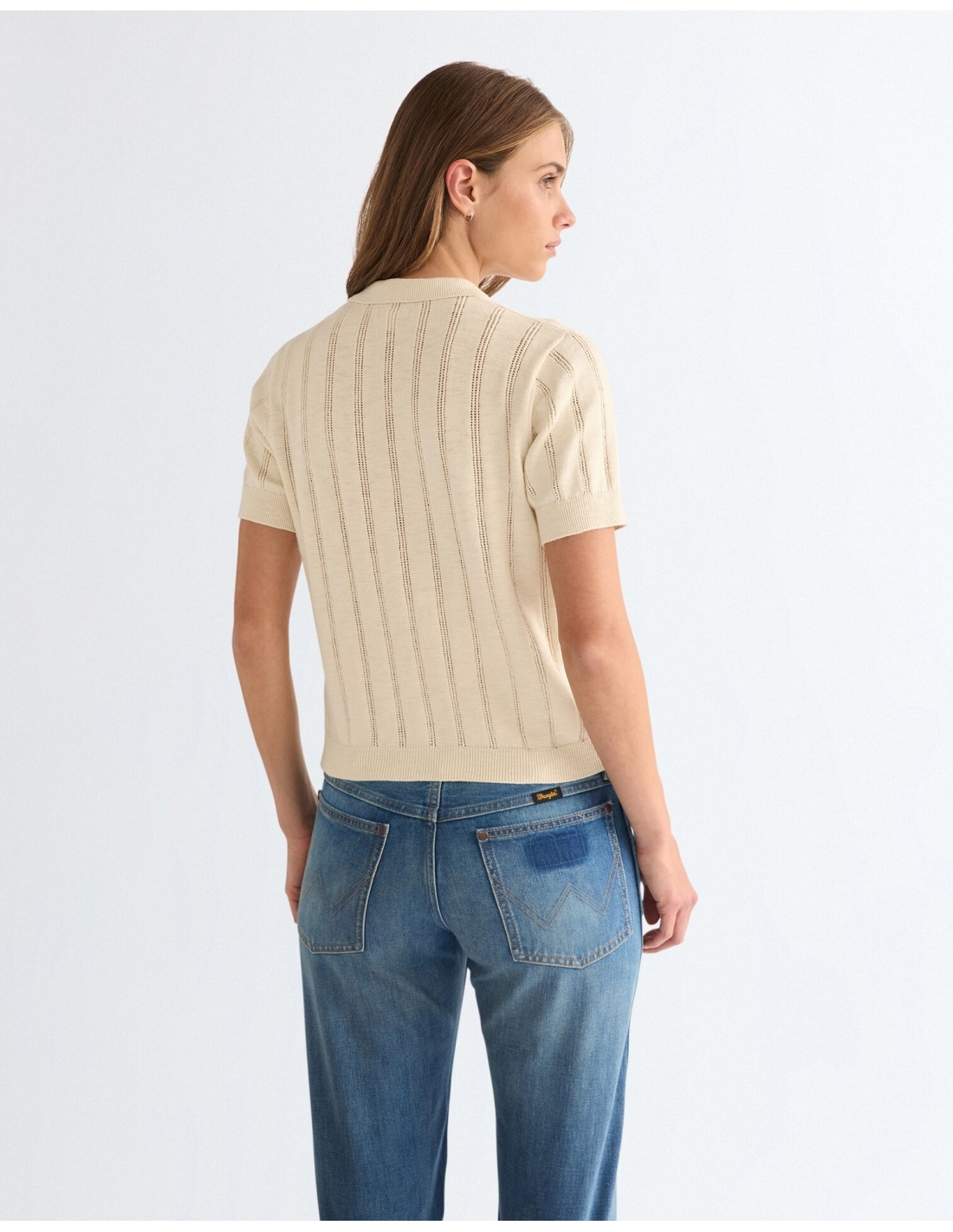 Stylowy damski sweter polo Wrangler, model 112378094, w eleganckim kolorze kremowym łączy w sobie codzienny komfort i charakterystyczny styl marki.