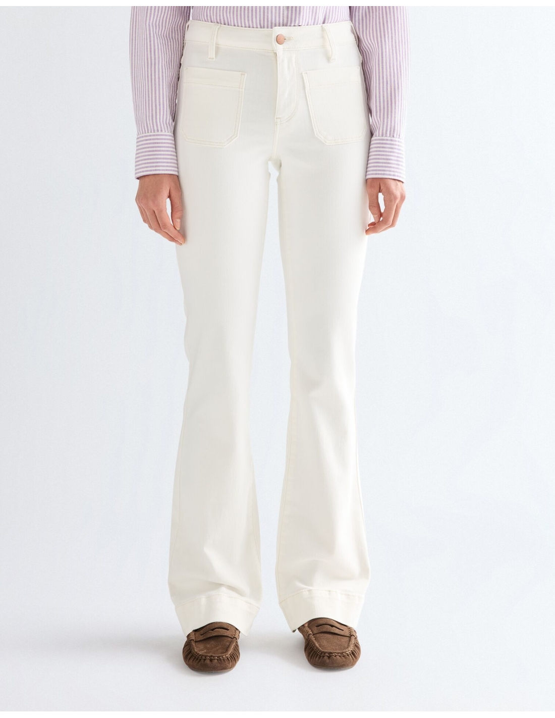 Spodnie posiadają modny fason flare (lekki dzwon), który delikatnie rozszerza się od kolana, oraz niski stan, podkreślający sylwetkę